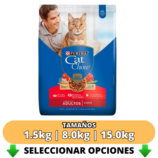 Cat Chow - Adultos Activos Carne con Forti defense, ofrece los nutrientes que tu gato necesita para mantenerse fuerte y saludable. Su fórmula contiene entre sus ingredientes proteínas de la carne, naturalmente ricas en hierro, que lo ayudan a desarrollar músculos fuertes, ZINC: contribuye a tener una piel y pelo sano.