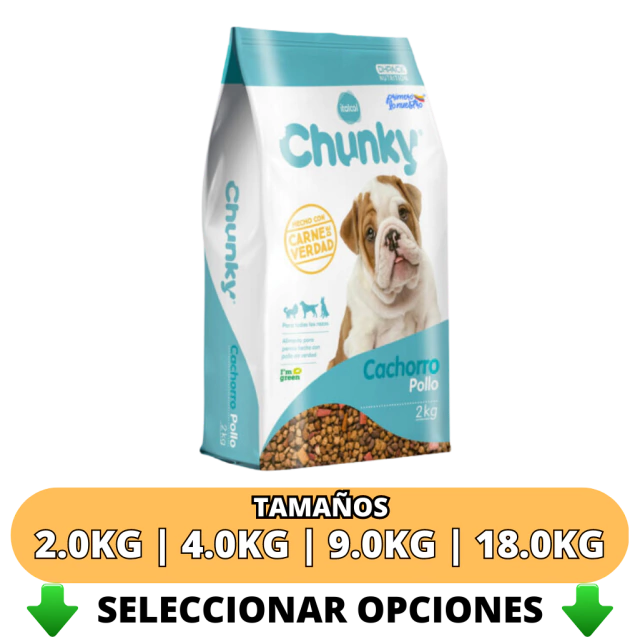 Chunky Pollo Cachorro, tiene los niveles perfectos de proteína, grasa y carbohidratos para cubrir con generosidad sus requerimientos. Recomendado en cachorros de todos los tamaños desde el destete hasta los 12 meses de edad. Chunky representa mejor nutrición para un sano crecimiento de tu cachorro, carne de pollo como fuente principal de proteína. Ácidos grasos y Omega 3 para el cuidado de piel y pelo de tu cachorro que favorecerán su salud en general, la digestión, protegerán el tracto gastrointestinal y el mantenimiento óptimo de la piel y el pelaje.