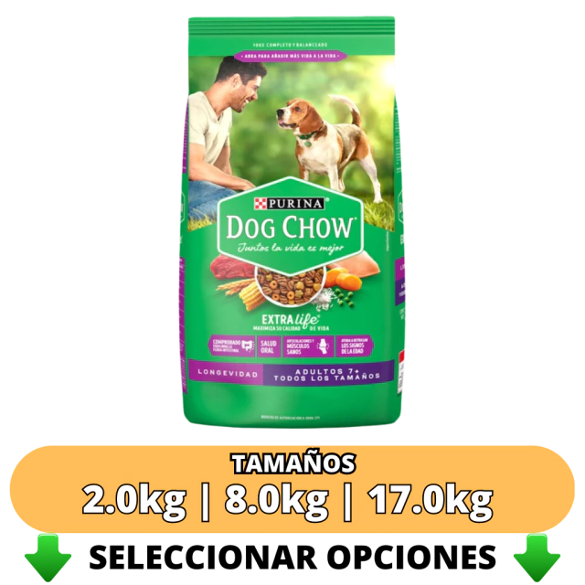 Dog Chow ahora vienen con Extralife, una mezcla especial con antioxidantes, vitaminas y minerales que ayuda a maximizar la calidad de vida de tu perro día tras día. Alimento completo para perros adultos de edad avanzada (mayores de 7 años) de todos las razas.